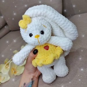 Try this free amigurumi bunny pattern and learn how to crochet a plush bunny in dress as a perfect gift for all little ones. The finished crochet bunny is about 21 cm (8.2″) tall without ears and 41 cm (16.1″) with ears, if you use the same yarn and hook.