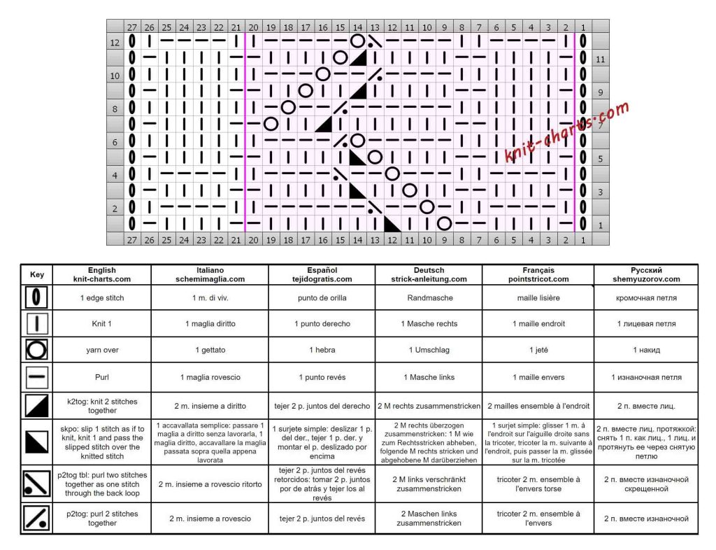 Row 11: edge st, * p1, k4, p2, k5, k2tog, yo, k4, p1 *; repeat from * to *; p1, k4, p1, edge st.