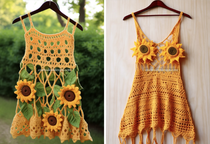 A cheerful sunflower-themed crochet sundress in yellow and green, perfect for sunny days at the beach.