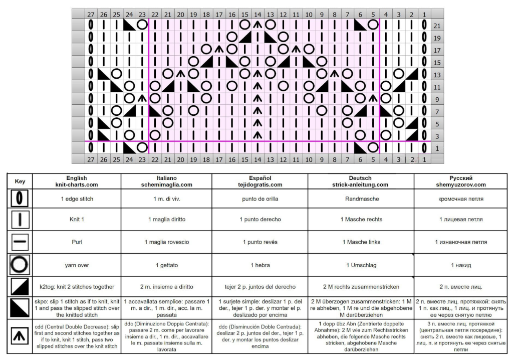 Row 21: edge st, k3, * yo, skpo, k6, yo, cdd, yo, k7, repeat from * to last 5 sts, yo, skpo, k2, edge st.